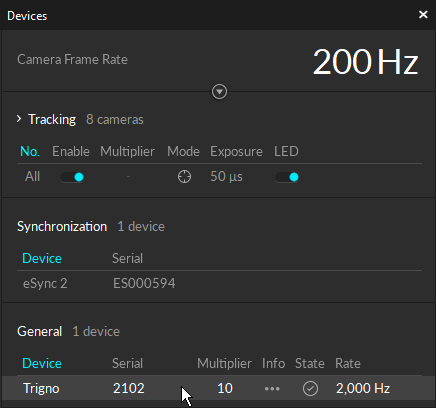 Open the Devices pane in Motive and connected Trigno device will be listed. If you click on the