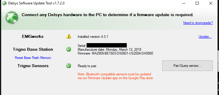 Firmware on both the Trigno base station and the sensors must be updated. If the firmware is installed, use the Software Update Tool to install the latest firmware. For more information, please refer to the manufacturer documentation.