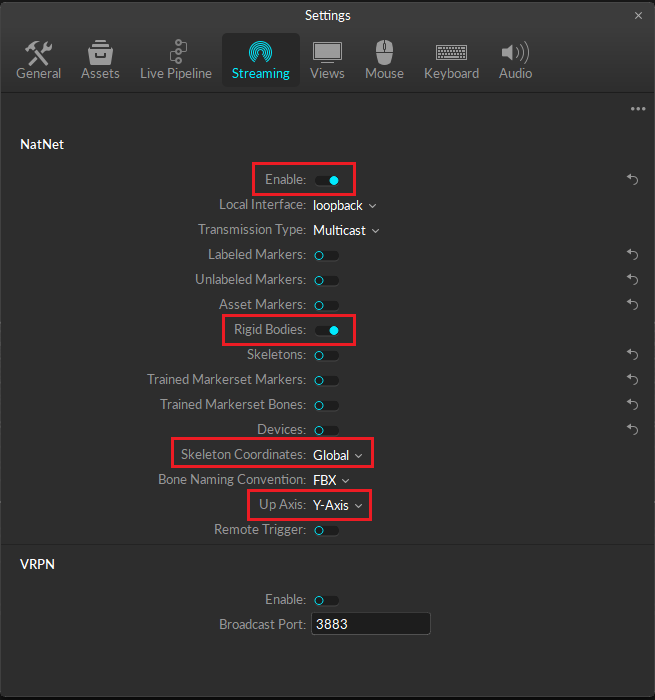 The OptiTrack Blender Plugin is designed to configure the necessary streaming settings automatically. This section covers the Motive settings needed for the Plugin to work effectively.