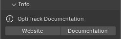The Info section of the plugin includes linked buttons to access the OptiTrack website and the Blender documentation in our online user guide (coming in release 1.1).