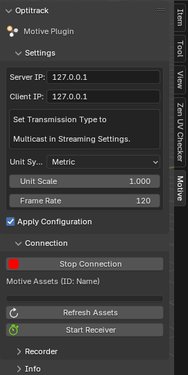 Once these settings are configured correctly, prepare your live Motive session or a Take to get ready to stream data into Blender.