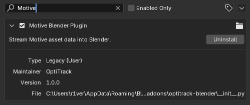 Search will return the Motive Blender Plugin. Check the checkbox to enable it.
