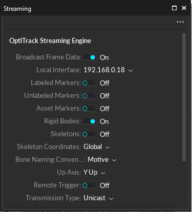 First, make sure the streaming settings are configured in Motive for streaming out the data. For more information on streaming in Motive please visit our Streaming page: