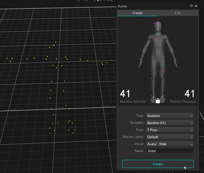 To define a skeleton, have the actor enter the volume with markers attached at appropriate locations. Open the Builder pane and select Skeleton and Create. Under the marker set section, select a marker set you wish to use, and a corresponding model with desired marker locations will be displayed. After verifying that the marker locations on the actor correspond to those in the Builder pane, instruct the actor to strike the calibration pose. Most common calibration pose used is the T-pose. The T-pose requires a proper standing posture with back straight and head looking directly forward. Then, both arms are stretched to sides, forming a “T” shape. While in T-pose, select all of the markers within the desired skeleton in the 3D view and click Create button in the Builder pane. In some cases, you may not need to select the markers if only the desired actor is in view.