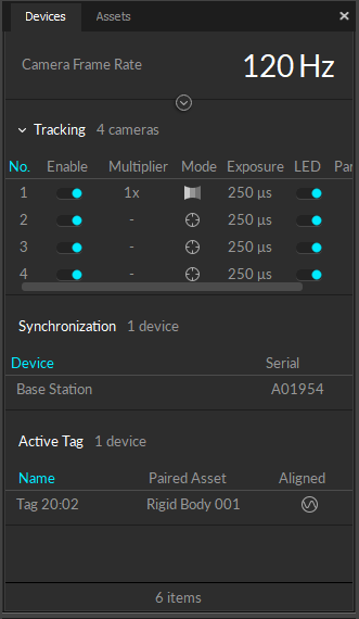 Active devices that connect to the camera system via BaseStations are listed in the Active Tag section. The following properties are available: