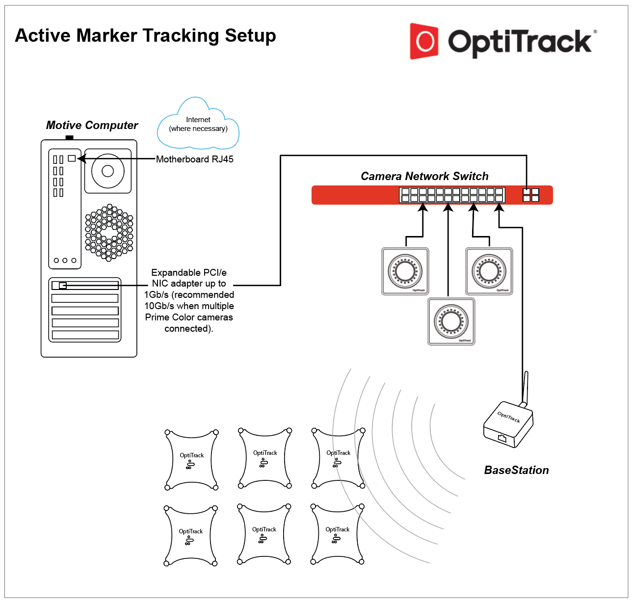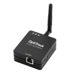 The BaseStation emits RF signals to the active markers, allowing precise synchronization between camera exposure and illumination of the LEDs. Each active marker is uniquely labeled in Motive, allowing more stable Rigid Body tracking since active markers will never be mislabeled and unique marker placements are no longer required for distinguishing multiple Rigid Bodies.