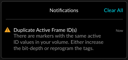 This Notification displays if more than one marker has the same ID. Duplicate IDs may cause errors during 3D reconstruction.