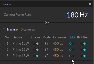 When tracking active markers only, the cameras do not need to emit IR lights. In this case, you can disable the LED lights in the Devices pane.