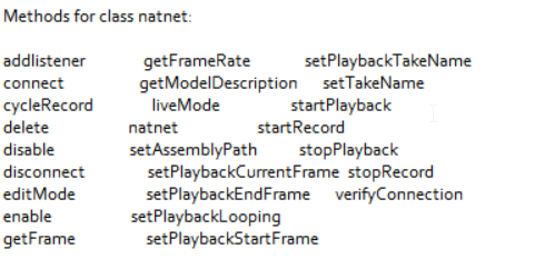 The natnet class also has functionality to control the Motive application. To enable recording use the startRcord and stopRecord methods, and for playback, use the startPlayback and stopPlayback methods. There are a number of additional commands as shown below.