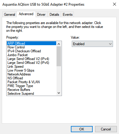For the Speed and Duplex property, you'll want to change this to the highest throughput of your NIC. If you have a 10Gbps NIC, you'll want to make sure that 10Gbps Full Duplex is selected. This property allows the NIC to operate at it's full range. If this setting is not altered to Full, Windows has the tendency to throttle the NIC throughput causing a 10Gbps NIC to only be sending data at 2Gbps.
