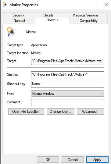 C:\Windows\System32\cmd.exe /C start "" /high "C:\Program Files\OptiTrack\Motive\Motive.exe"