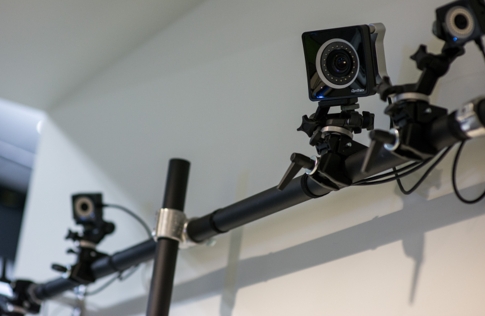 Wall mounts and speed rails are used with camera clamps to mount the cameras along the wall of the capture volume. This setup is very stable, and it has a low chance of getting interfered with by way of physical contact. The capture volume size and layout will depend on the size of the room. However, note that the wall, or the building itself, may slightly fluctuate due to the changing ambient temperature throughout the day. Therefore, you may need to routinely re-calibrate the volume if you are looking for precise measurements.