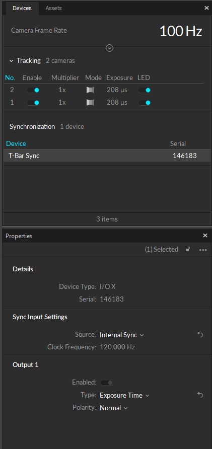 The Duo 3 and Trio 3 cameras use a preset frequency for timing and can run at 25 Hz, 50 Hz or 100 Hz. To synchronize other devices with the Duo or Trio, use a BNC cable to connect an input port on the receiving device to the Sync Out port on the I/O-X device.