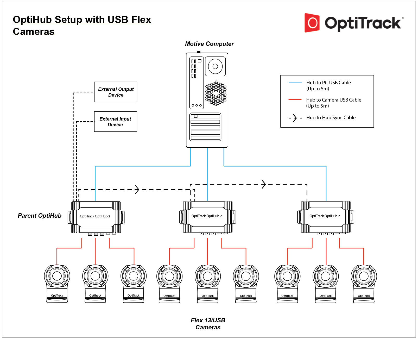 For each USB system, up to four OptiHubs can be used. When incorporating multiple OptiHubs in the system, use RCA synchronization cables to interconnect each hub. A USB system is not suitable for a large volume setup because the USB 2.0 cables used to wire the cameras have a 5-meter length limitation.