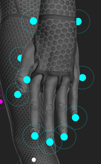 The Active Finger Markerset uses a total of 10 markers per hand, 8 active with 2 passive markers attached at the wrist.