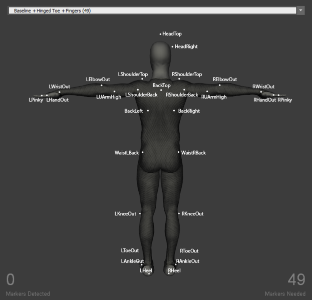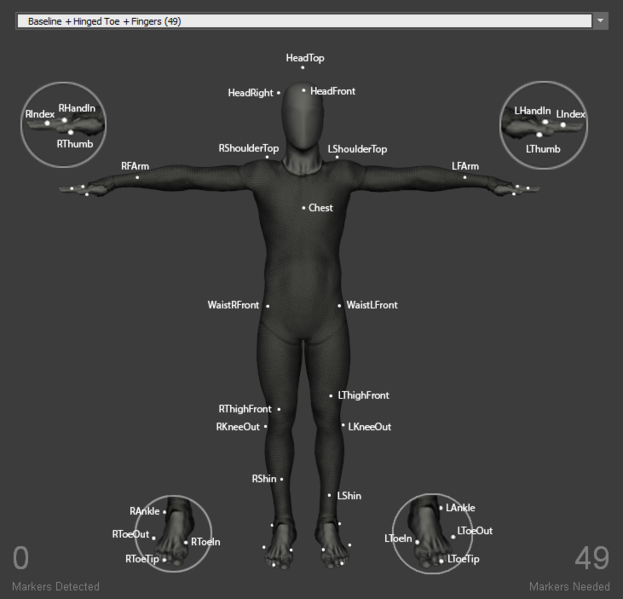 Hinged toe Marker Sets create toe segments in the Skeleton. Two additional markers are added to each foot, one on the toe-tip and another on the heel. The hinged toe markers are included in all baseline Marker Sets except for Baseline (37) and Upper Body Marker Sets.