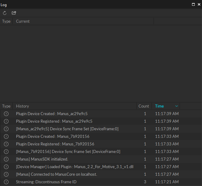 The Log pane will record several informational entries when Manus gloves are connected: