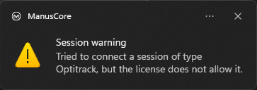 Manus Core requires the appropriate license for streaming to Motive. If that license is not found, Motive will report an error when the program is launched.