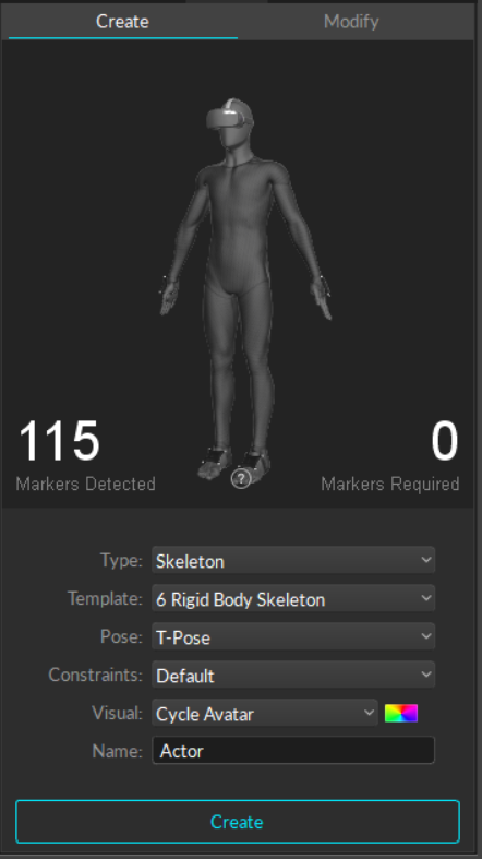 Ask the subject to strike the selected calibration pose (e.g. T-Pose). Then select the two rigid bodies (head or HMDHead and chest or hip) and press Create on the Builder pane. This action will automatically define rigid bodies for the remaining rigid bodies on the hand/foot, and also place the pivot points at the proper location automatically. All of the rigid bodies will have the prefix with the name given to the skeleton (see screenshot below), and the skeleton will be created and tracked.