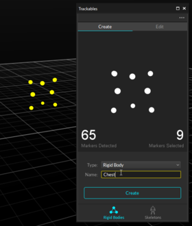 Let's first start with defining a rigid body for the chest rigid body. Open up the Builder pane, make sure the Rigid Bodies option is selected at the bottom, and access the Create tab. This will bring up options for defining rigid bodies in Motive.