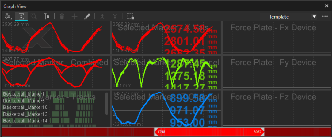 In Edit Mode, graphs are used to review and post-process the captured data. In addition to the graphs available in Live mode, edit mode includes the ability to graph 3D positions of reconstructed markers.