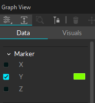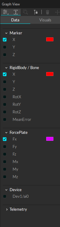 Only enabled, or checked, data channels will be plotted on the selected graph using the color specified. Once channels are enabled, one or more objects (marker, Rigid Body, Skeleton, force plate, or DAQ channel) must be selected (or locked) to display data in the graph.
