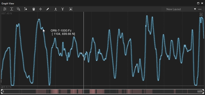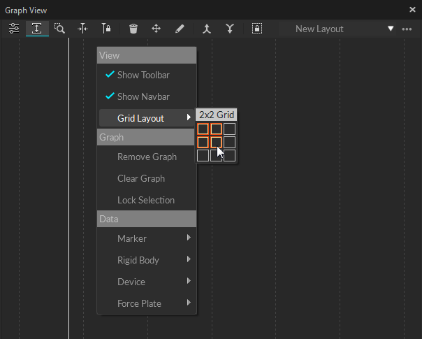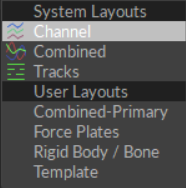 In addition to the standard graph layouts (channel, combined, tracked), the user can create custom layouts to monitor specific data channels only. Motive allows up to 9 graphs plotted in each layout and up to two graph view panes to be opened simultaneously.