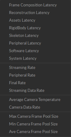 In Edit mode, the graph displays data from the original capture and is not affected by changes made to the Take in post production such as adding or deleting assets. This allows OptiTrack Support Engineers to observe system information from a recorded Take while troubleshooting issues that occurred during a capture.