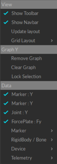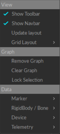 Telemetry graphs can be selected from the Data tab of the Graph Editor or by right-clicking on a user layout and selecting Telemetry, which displays the menu shown below.