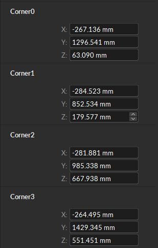Displays the positions of the four force plate corners. Positions are measured with respect to the global coordinate system, which is calibrated when you Set Position using the CS-400 calibration square.