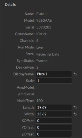 Select a force plate in the Devices pane or in the 3D viewport, and the corresponding properties will be listed under the Properties pane. These properties can be modified only in Live mode.