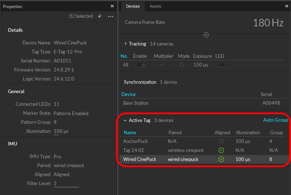 Active devices such as CinePucks and Pucks are often equipped with an Inertial Measurement Unit (IMU) that increases the accuracy of tracking when fused with the rigid body. To learn more about pairing IMUs to Rigid Bodies, read the IMU Sensor Fusion page.