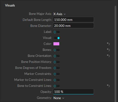 Set the color of the bone in the 3D Perspective View. By default, the bone uses the same color as the Rigid Body asset.