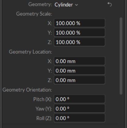 Whenever a geometric model is attached, settings to adjust the scale, location, and orientation (Pitch, Yaw, and Roll) are available.