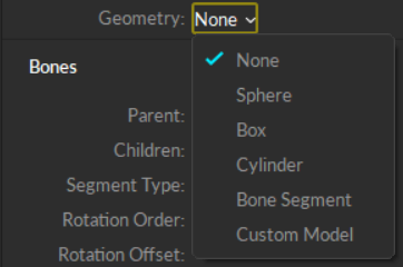 Attach a valid geometric model to the rigid body to display in the the 3D Viewport. Sphere, box, cylinder, and bone segment shapes are built-in; to use your own geometric model, select Custom Model. This will open the Attached Geometry field.