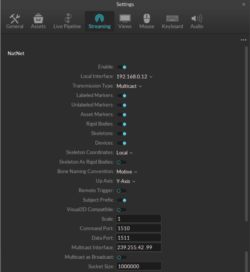(Default: Motive) Sets the bone naming convention of the streamed data. Available conventions include Motive, FBX, and BVH. The naming convention must match the format used in the streaming destination.