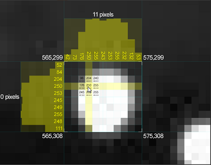 In pixel inspection mode, the camera viewport displays the X,Y coordinates of the cursor location, and pixel brightness for selected pixels when a region is drag-selected. Inspecting pixel brightness can be useful during camera focusing, tuning, and aiming.
