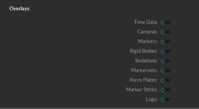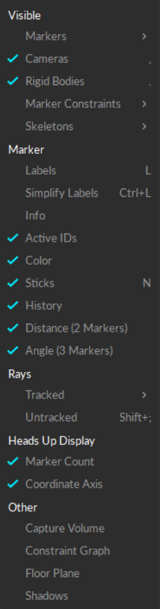 Opens a menu to enable or disable visuals in the perspective viewport. From this menu, you can show or hide markers, marker labels, Rigid Bodies, Skeletons, tracked rays, and more.