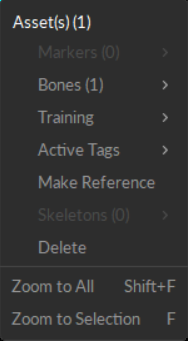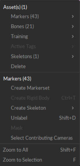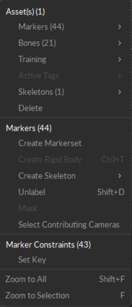 Right-click an asset, marker, or camera in the Perspective Viewport to open a context menu specific to the selection. The menu displays the number of objects (markers, rigid bodies, etc.) that will be affected by any changes made.