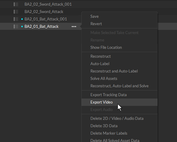 Reference video can be exported from Motive with the asset overlay. To export, right-click the Take and select Export Video. In the export options, select the assets to overlay in the video. Please see the Reference Video Export section of the Data Export page for more information on exporting reference videos.