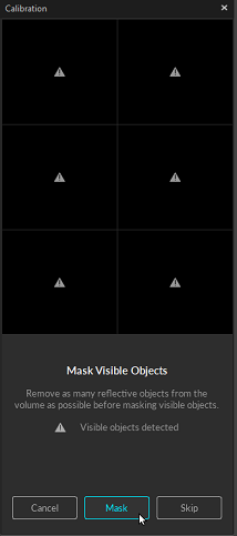 In the Calibration pane, click Mask to apply masks over all reflections in the view that cannot be removed or covered, such as other cameras.
