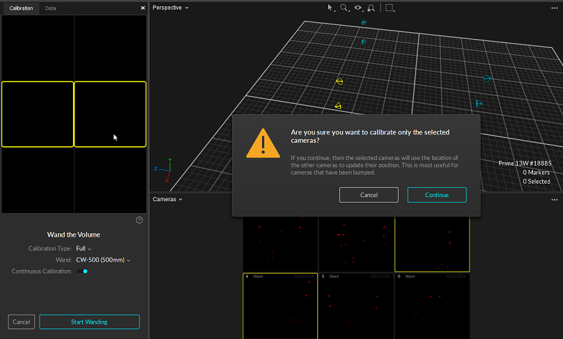From the Calibration Pane, click Start Wanding. A warning message will ask you to confirm that only the selected cameras will be calibrated. Click continue.