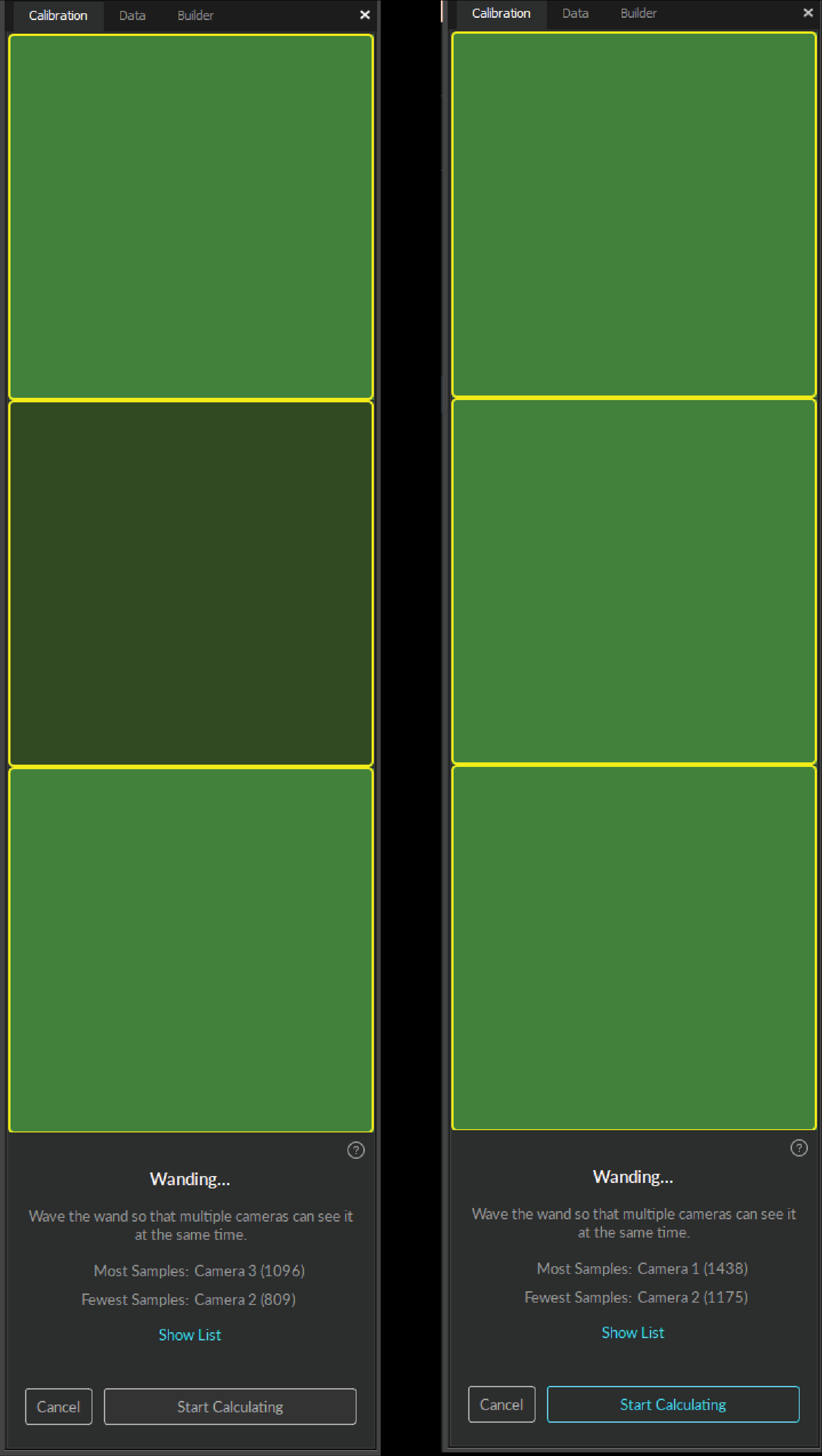 Continue wanding until the camera squares in the Calibration pane turn from dark green (insufficient number of samples) to light green (sufficient number of samples). Once all the squares have turned light green the Start Calculating button will become active.