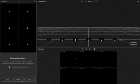 Before performing a system calibration, all extraneous reflections or unnecessary markers should be removed or covered so they are not seen by the cameras. When this isn't possible, extraneous reflections can be ignored by masking them in Motive.