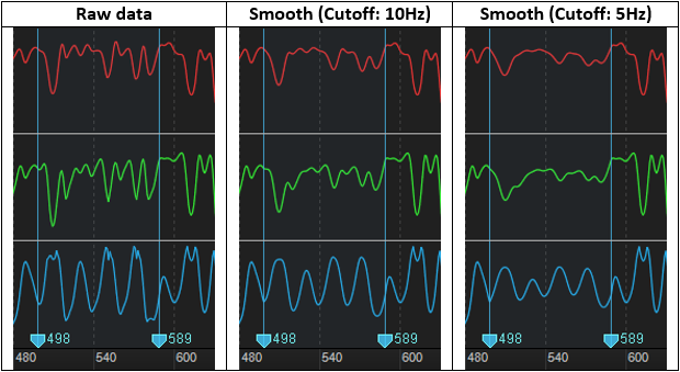 The curves tool applies a noise filter (low-pass Butterworth, 4th degree) to trajectory data, and this modifies the marker trajectory smoother. This is a bi-directional filter that does not introduce phase shifts. Using this tool, any vibrating or fluttering movements are filtered out. First, set the cutoff frequency for the filter and define how strongly your data will be smoothed. When the cutoff frequency is set high, only high-frequency signals are filtered. When the cutoff frequency is low, trajectory signals at a lower frequency range will also be filtered. In other words, a low cutoff frequency setting will smooth most of the transitioning trajectories, whereas high cutoff frequency setting will smooth only the fluttering trajectories. High-frequency data are present during sharp transitions, and this can also be introduced by signal noise. Commonly used ranges for Filter Cutoff Frequency are between 7 Hz to 12 Hz, but you may want to adjust the value higher for fast and sharp motions to avoid softening motion transitions need to stay sharp.\