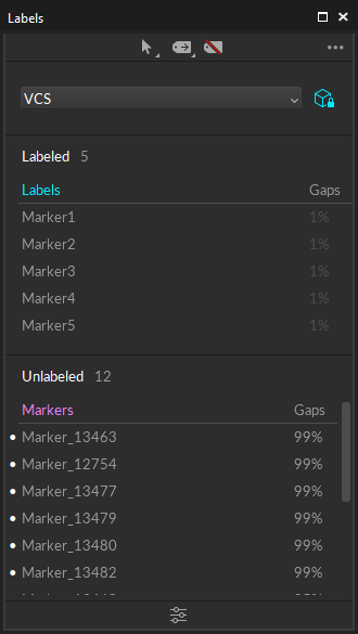 The first step in the post-processing is to check for labeling errors. Labels can be lost or mislabeled to irrelevant markers either momentarily or entirely during capture. Especially when the marker placement is not optimized or when there are extraneous reflections, labeling errors may occur. As mentioned in other pages, marker labels are vital when tracking a set of markers, because each label affects how the overall set is represented. Examine through the recorded capture and spot the labeling errors from the perspective view, or by checking the trajectories on the Graph pane for suspicious markers. Use the Labels pane or the Tracks View mode from the Graph pane to monitor unlabeled markers in the Take.