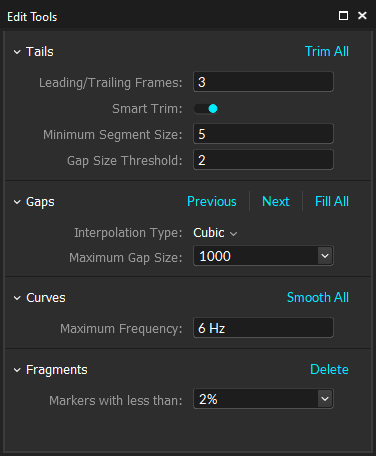 The Edit Tools provide functionality to modify and clean-up 3D trajectory data after a capture has been taken. multiple post-processing methods are featured in the Edit Tools for different purposes: Trim Tails, Fill Gaps, Smooth, and Swap Fix. The Trim Tails method is used to remove data points in few frames before and after a gap. The Fill Gaps method calculates the missing marker trajectory using interpolation methods. The Smoothing method filters out unwanted noise in the trajectory signal. Finally, the Swapping method switches marker labels for two selected markers. Remember that modifying data using Edit Tools changes the raw trajectories, and an overuse of Edit Tools is not recommended. Read through each method and familiarize yourself with the Editing Tools. Note that you can undo and redo all changes made using Edit Tools.
