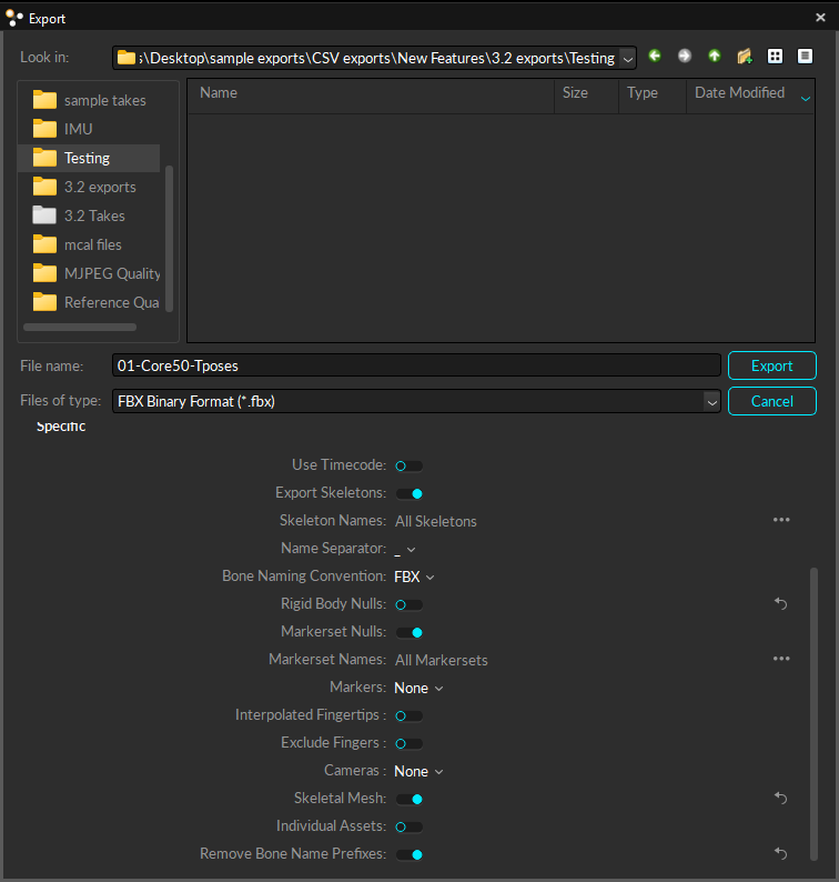 Binary FBX files are more compact than ASCII FBX files. Reconstructed 3D marker data is not included within this file type, but selected Skeletons are exported by saving corresponding joint angles and segment lengths. For Rigid Bodies, positions and orientations at the defined Rigid Body origin are exported.
