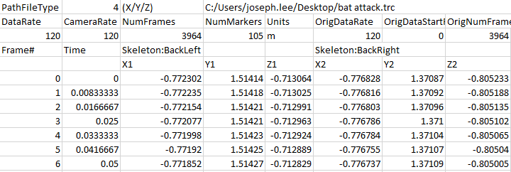 Captured tracking data can be exported into a Track Row Column (TRC) file, which is a format used in various mocap applications. Exported TRC files can also be accessed from spreadsheet software (e.g. Excel). These files contain raw output data from capture, which include positional data of each labeled and unlabeled marker from a selected Take. Expected marker locations and segment orientation data are not included in the exported files. The header contains basic information such as file name, frame rate, time, number of frames, and corresponding marker labels. Corresponding XYZ data is displayed in the remaining rows of the file.
