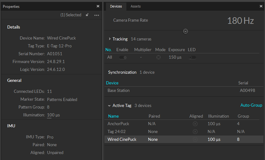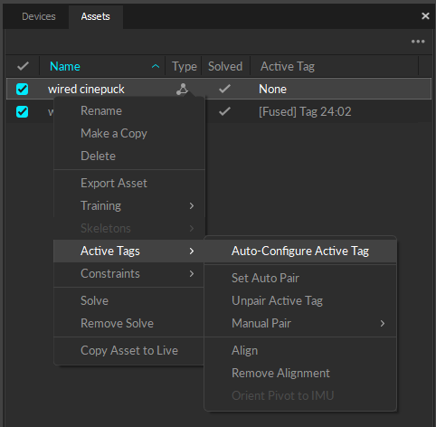 Right click the header of the Assets pane to add columns. For this IMU workflow, we recommend adding the Active Tag column. The Active Tag column will display the status along with the ID of the paired device.